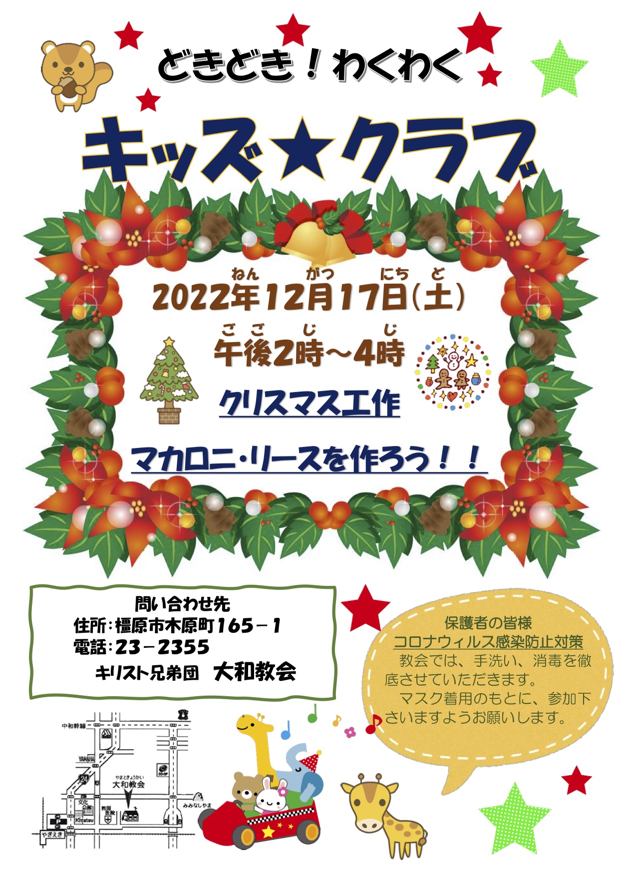 保護者の皆様へ 「コロナウィルス感染防止対策」 教会では、手洗い、消毒を徹底させていただきます。 マスク着用のもとに、参加下さいますようお願いします。