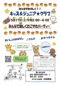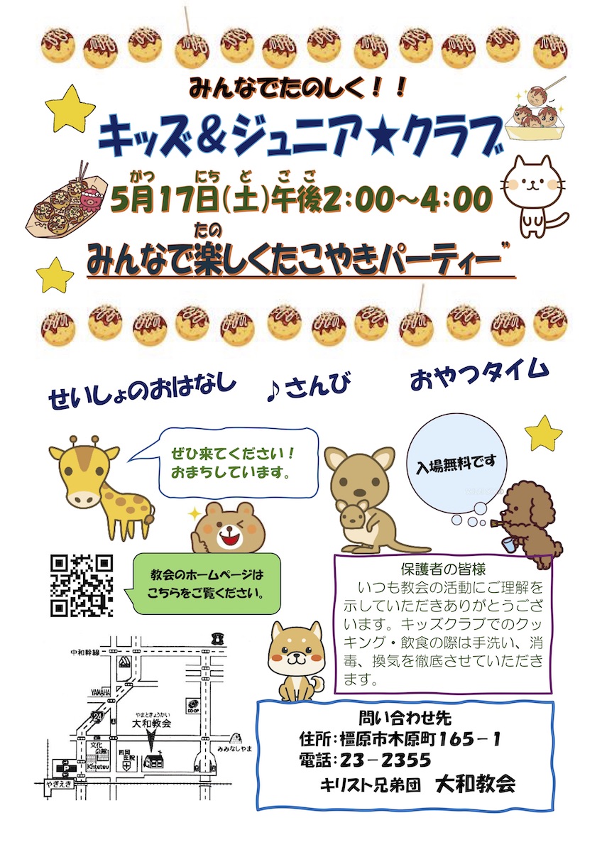 日時:2025年5月17日(土) 午後2時~4時 場所:キリスト兄弟団大和教会 【入場無料です】 ぜひきてください!おまちしています。 *みんなで楽しくたこやきパーティー *おやつタイム *せいしょのおはなし *さんび♫