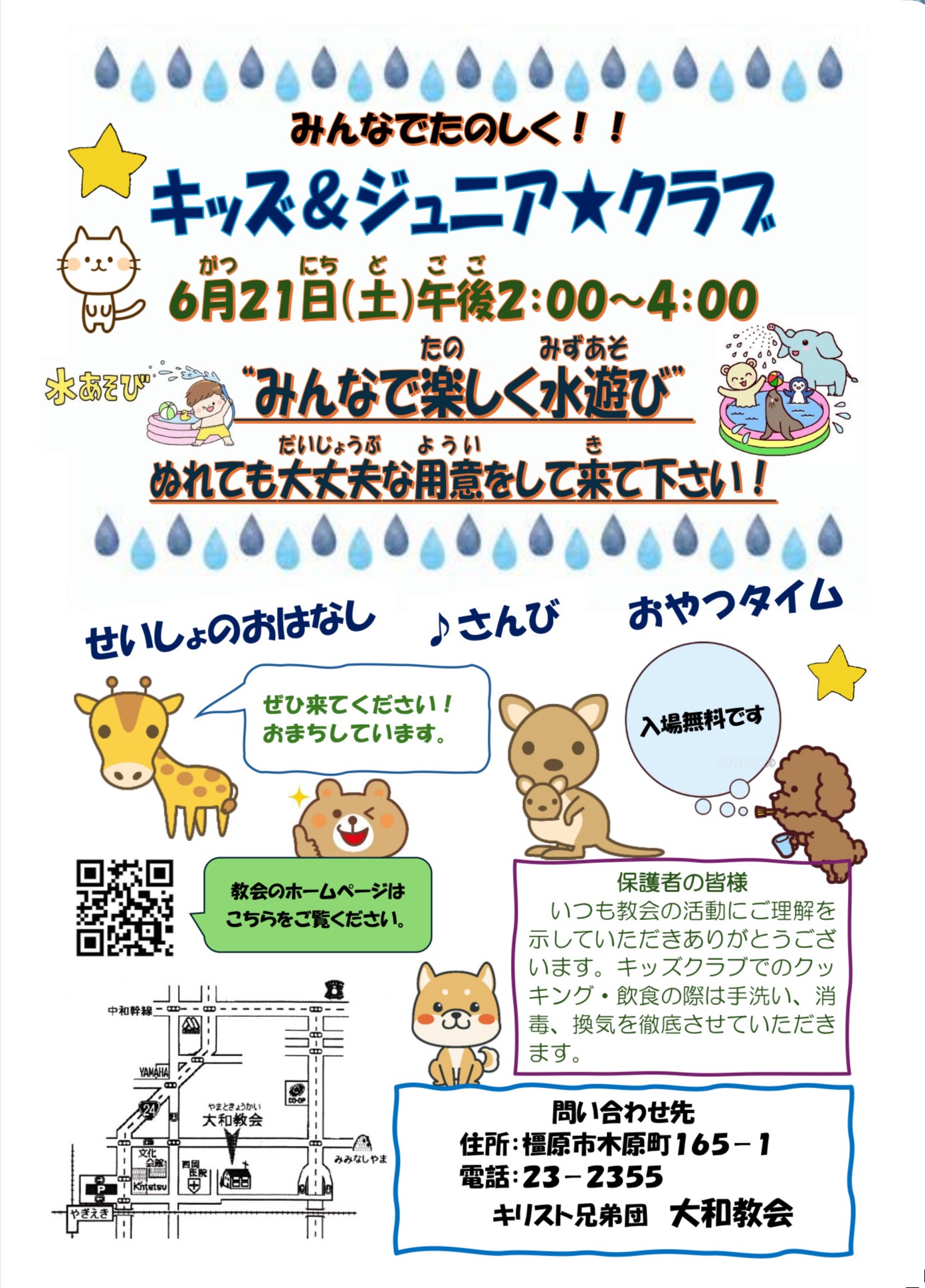 日時:2025年6月21日(土) 午後2時~4時 場所:キリスト兄弟団大和教会 【入場無料です】 ぜひきてください!おまちしています。 *みんなで楽しく水遊び(ぬれても大丈夫な用意をして来て下さい!)