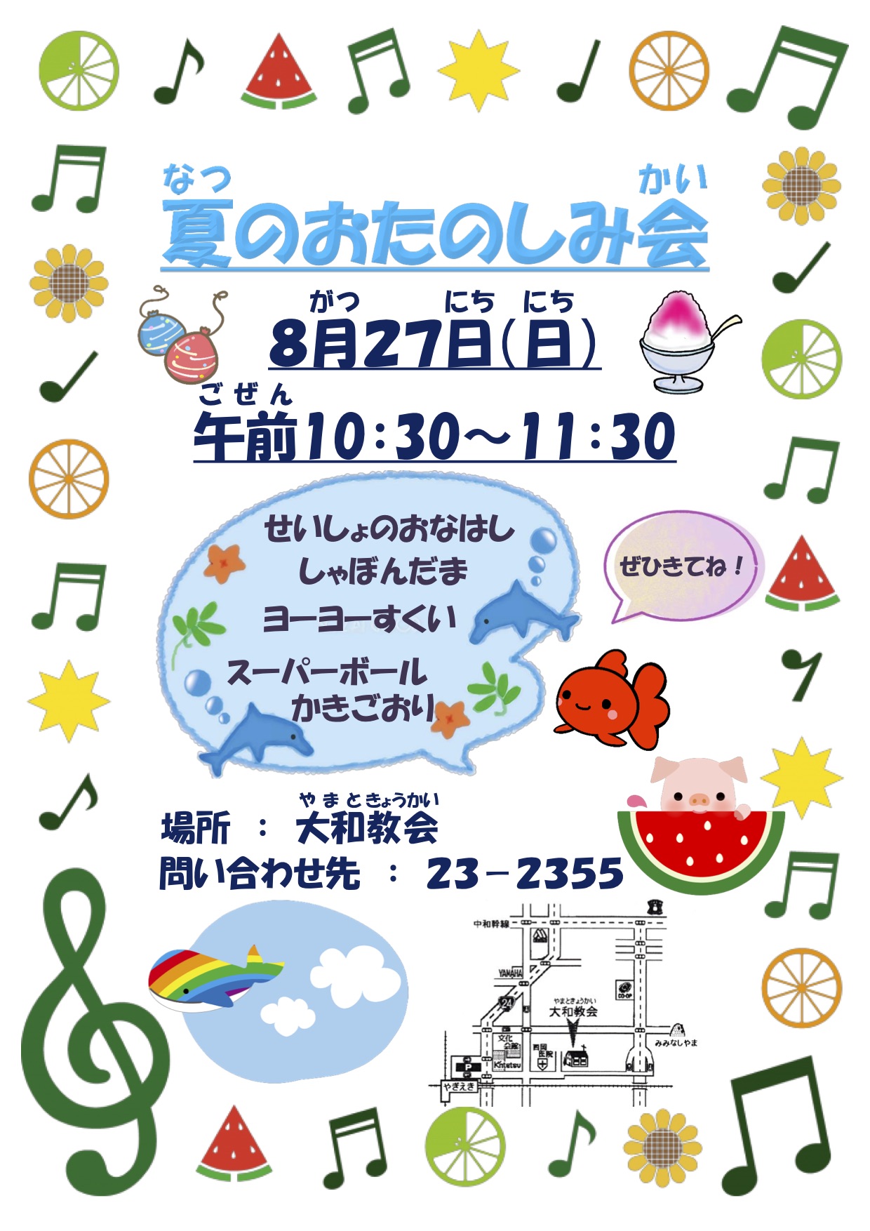 夏のおたのしみ会 2023年8月27日(日) 午前10:30〜11:30 場所:キリスト兄弟団大和教会